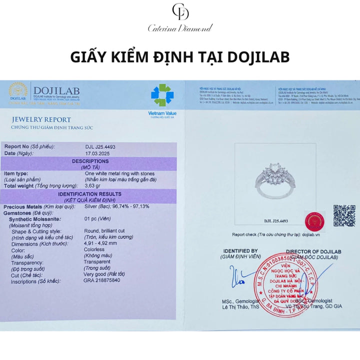 - 1 sản phẩm khách nhận được khi mua hàng có đầy đủ : THẺ NHỰA và GIẤY KIỂM ĐỊNH GRA kim cương nhân tạo